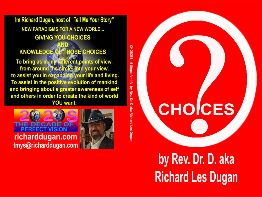 Im Richard Dugan, host of ...and author of It is said that you are where you are because of the 'choices you've made in the past. If you don't like where you are today, and don't want to be there tomorrow,. What are your dreams? Make a choice, that's the first step. Then follow the other 4 steps to make that choice/dream a reality. "Do you want to live or do you want to die.” “I'll support you in whichever choice you make. I may not like it but I will honor you and your choice."